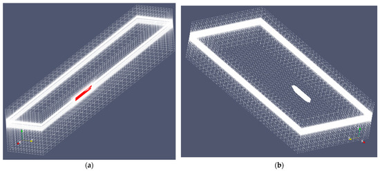 Grid distribution on far field boundaries: (a) resistance (the hull surface is in red color); (b) self-propulsion test.