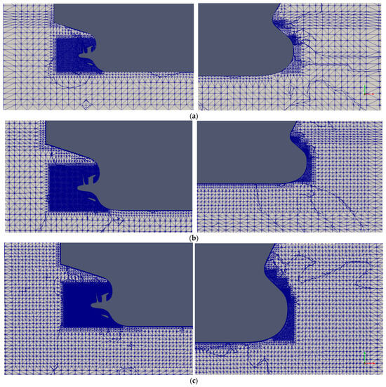 The unstructured grid topology around the ship bow (right) and stern (left) for self-propulsion simulation: (a) coarse grid; (b) medium grid; (c) fine grid.