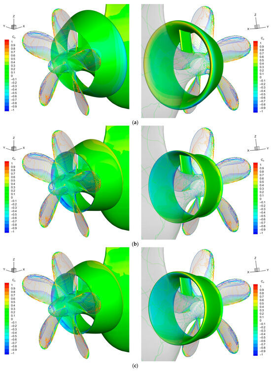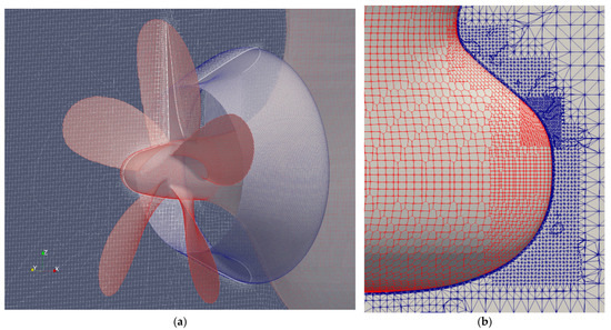 The layered grids attached on the solid surface to resolve the boundary layer flow can be observed in Figure 6. The layer number of layered grids is 3 on the hull, 4~5 on the duct, and 4 on the propeller. To form a good quality body-fitted (surface) grid and layered grid, an additional grid refinement is added for self-propulsion (Figure 5 left column) in the stern region. As a result, the complicated and delicate geometry details of the stern shape, duct, and propeller are captured in Figure 6a. Those appendages are, relatively, much smaller than the hull body. The stern is characterized by a blunt and curvy lower bottom and sharp upper part toward the centerline plane. A series of grid refinement is also arranged along the bulbous bow (see Figure 5, right column, and Figure 6b). This is required because the propeller has very different feature edges compared with the other parts of the ship. The layered grid generation is influenced by the propeller appearance, and results in low coverage. This bow refinement is unnecessary in the resistance test. The stern refinement is excluded in the resistance test without the duct. In the OPT, the Cartesian meshing method and (stern) grid refinement are inherited from the self-propulsion test. Consequently, the grid generation result around the propeller is shown in Figure 7.