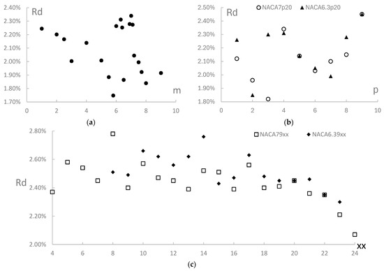 NACA 4-digits design for the duct section: (a) NACA m420 series; (b) NACA6.3p20 and 7p20; (c) NACA6.39xx and 79xx.