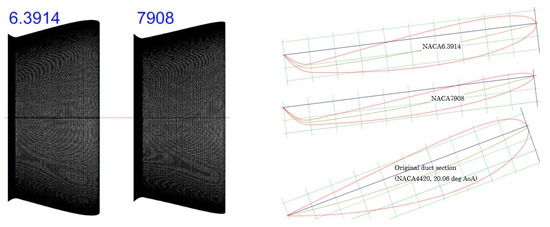 In our work, the parameter of the NACA’s four digits covers the whole range for m and p, with c fixed as the original duct. AOA = 7.06 deg had been found as in our previous work [35], comparable to the 8.7 deg of [33] and 9 deg of runs 1 and 2 in [34]. t = 0.4~0.24c.