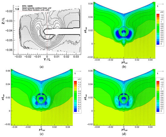 The results of stages 1,2,3 are presented in the following Section 3.1, 3.2, and 3.3, respectively. In stage 1, the V and V (Verification and Validation) analysis is conducted to ensure our CFD method is reliable before further application to the design procedure: stages 2 and 3. The V and V theory used here is based on the ITTC (International Towing Tank Conference) 75-03-01-01 guideline [36]. The simulations for V and V were conducted based on the experimental conditions of the test cases suggested by T2015 [1]. The simulation results are compared to the experimental data provided by T2015 [1], including OPT. Stages 1a, 1b, and 1d correspond to the T2015 test cases 1.1, 1.2, and 1.6, respectively. In stage 2, the lowest resistance reduction, i.e., the total ship resistance difference between the original duct and other design, is pursued. In stage 3, the self-propulsion point is simulated and found by CFD simulation for the ship with the appended optimal duct from stage 2. The improvement of self-propulsion performance compared with the original duct is discussed.