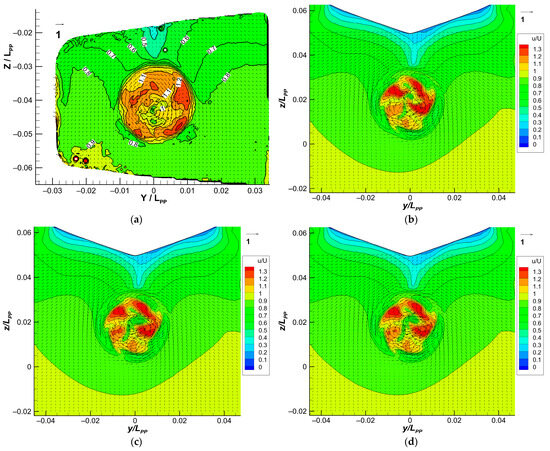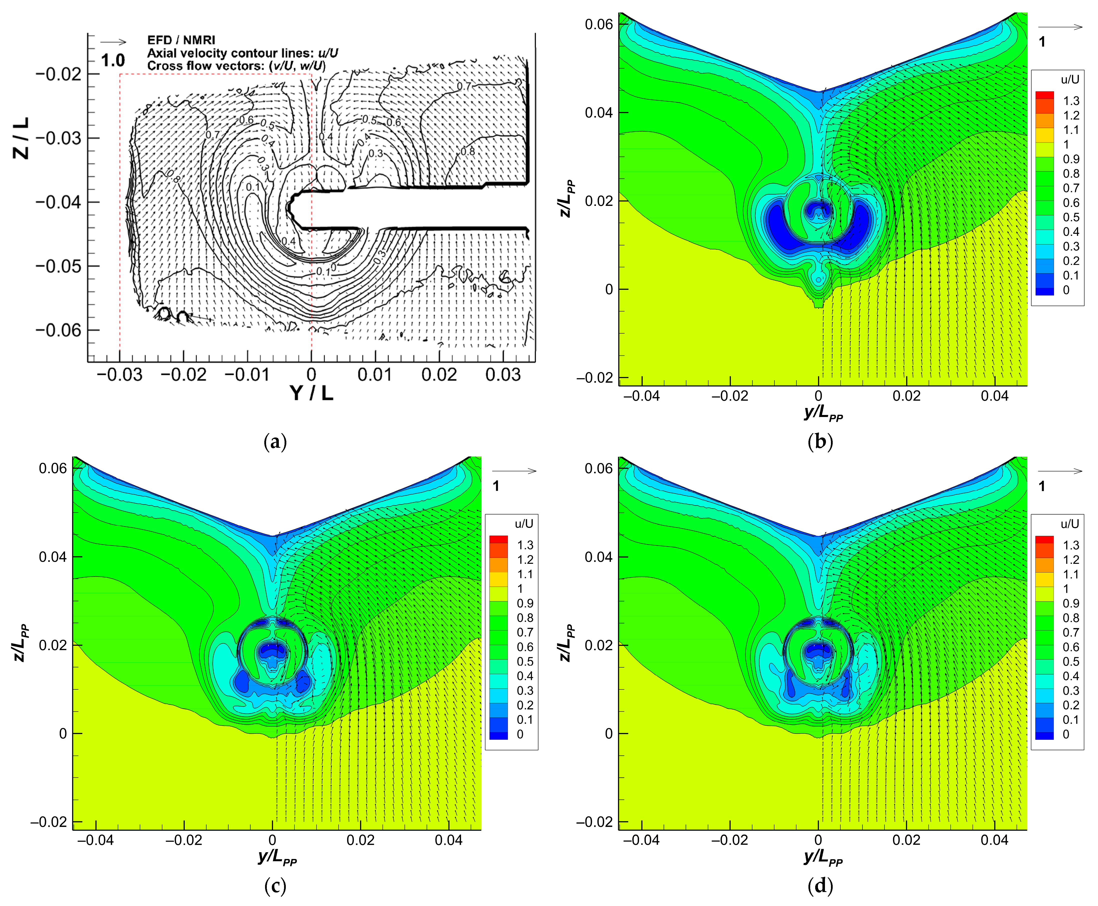The S-PIV (Stereoscopic Particle Image Velocimetry) measurement for the wake field behind a PSD or PSS mounted on a C259 bulk carrier was conducted by Falchi and Aloisio [10]. Three PSDs and one PSS were tested. Great insight into the fluid mechanism of the ESDs was gleaned. The objective ship was that the nominal and propeller wakes were measured on the propeller plane, and 41.4 mm behind the plane, respectively. In the nominal wakes, the fins inside the PSDs eliminated the portside bilge vortex with two vertically located vortices induced underneath the shaft tube. The flow acceleration of the propeller wake remained as the velocity distribution without ESDs. However, in the case of the PSS, the bilge vortices on the starboard and port sides only move their position. In addition, two vortices under the shaft tube and starboard outer region were generated. Corresponding to the propeller wake, the high velocity profile deforms, and another high velocity region was formed in the upper portside.