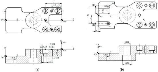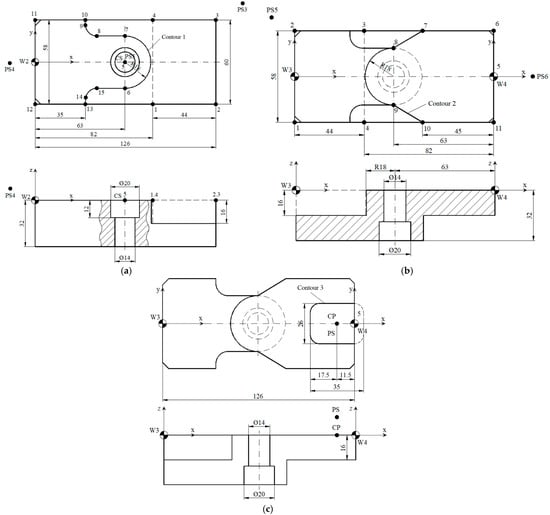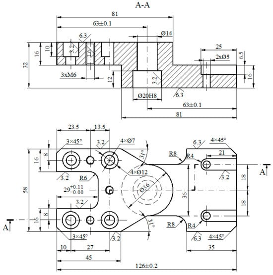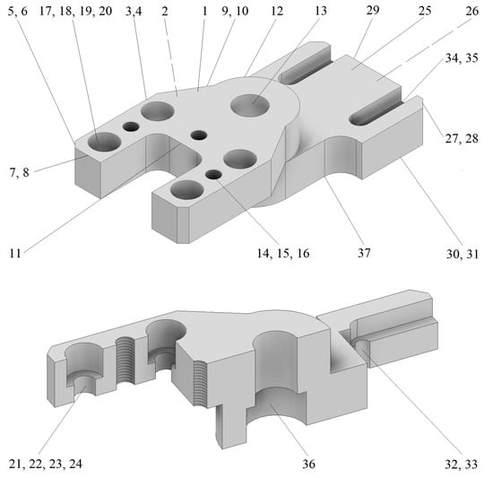 | Z | −16 | −16 | −16 | −16 | −5—center drilling −35—drilling Ø10 (32 + 3) −33—counterboring Ø14 −12—counterboring Ø20 | 5 | 10 | 20 | - |