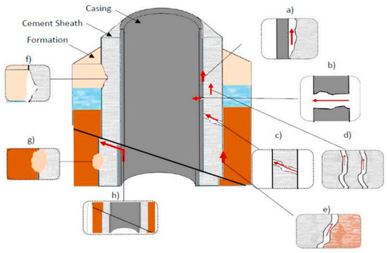 Well integrity failures and leakage pathways (indicated by the red arrow) [36] (a) Leakage pathways created along the micro-annuli at the cement sheath interfaces with the casing, (b) Leakage pathways due to mechanical failure of the casing or corrosion, (c) Leakage pathways due to cement mechanical failure, (d) Poor bonding due to the development of channels in the cement, (e) Leakage pathways created along the micro-annuli at the cement sheath interfaces with the formation, (f) An unsatisfactory annular cementing job when cement does not fill the annulus entirely, (g) Poor bonding due to the existence of mud cake, and (h) The creation of shear failure zone in the formation and casing above the reservoir.