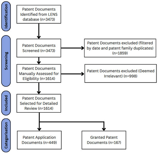 As illustrated in Figure 2, the search process began by retrieving 3473 patent documents from the Lens.org database using relevant keywords and IPC codes. The search was conducted on 12 September 2024 and covered filings from 1 September 2004 to 1 September 2024, ensuring a 20-year window focused on modern innovations and avoiding outdated technologies. To eliminate redundancies, a deduplication process was performed based on patent family groupings, accounting for multiple filings of the same invention across multiple jurisdictions, and thereby, reducing the dataset to 1614 unique patent documents. Subsequently, a manual screening process was conducted to assess relevance to CBL technologies, with a total of 999 irrelevant patents excluded due to misclassification and irrelevance. This results in 616 relevant patents, comprising 167 granted patents and 449 published patent applications.
