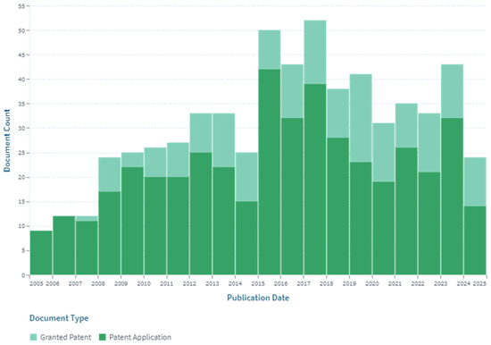 While both granted and published patents were considered for bibliometric analysis, such as filing trends and geographical distribution, only the 167 granted patents were subjected to detailed technology updates. This distinction is essential, as granted patents represent legally approved inventions and offer a stable reference for analyzing technological maturity and industry priorities, whilst patent applications are still pending examinations and are subject to amendments prior to grant or even rejection. Accordingly, this study prioritizes granted patents for its core analysis.