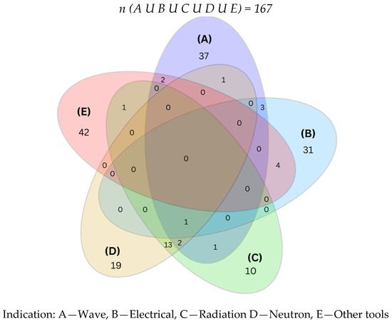 The Venn diagram in Figure 6 illustrates the distribution of the 167 granted patents across five technology categories related to cement bond logs: Wave (A), Electrical (B), Radiation (C), Neutron (D), and Other Tools (E). Each of these technologies plays an important role in the evaluation of well integrity, as previously introduced in Figure 3. Among the 167 patents, the largest number—42 patents (25.1%)—falls under the Other Tools (E) category. This category includes tools that are either unspecified or advanced well-logging systems not classifiable under traditional categories. The size of this group suggests a rising demand for specialized and adaptable systems capable of addressing complex well integrity challenges. Following this, Wave-based technologies (A)—which include sonic and ultrasonic tools—account for 37 patents (22.2%), reaffirming their central role in acoustic-based evaluation. Electrical tools (B), which include resistivity and electromagnetic systems, make up 31 patents (18.6%). Neutron-based tools (D), used primarily to assess porosity and hydrogen content, comprise 19 patents (11.4%). Finally, Radiation tools (C), such as gamma-ray and X-ray instruments, represent the smallest share, with 10 patents (6.0%).