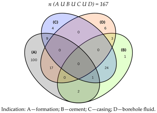 Moreover, two patents (1.2%) integrate three technologies simultaneously—Wave, Radiation, and Neutron (A ∩ C ∩ D)—demonstrating a more sophisticated approach to well evaluation. One patent (0.6%) includes a rare integration of four technologies: Wave, Electrical, Radiation, and Neutron (A ∩ B ∩ C ∩ D), offering a holistic solution for integrity assessment. Such multi-functional tools are designed to reduce costs while increasing accuracy, particularly beneficial in harsh environments like deep or offshore wells. Figure 7 illustrates the comparison between multi-functional and single-function tools. A total of 28 patents demonstrates the integration of multiple technologies, while the remaining 145 patents are categorized as non-overlapping—each using only one technology type.