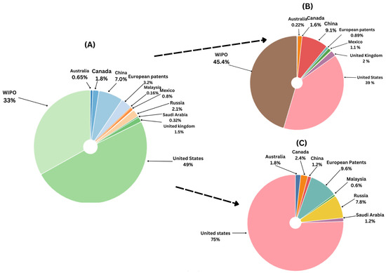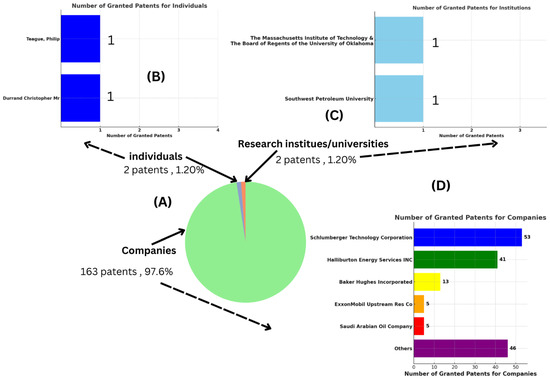 Figure 10 presents three charts that illustrate the distribution of patent activity across countries based on primary filing jurisdiction rather than the nationality or corporate headquarters of applicants. Any patent initially filed through the United States Patent and Trademark Office (USPTO), for instance, is attributed to the United States, regardless of whether the applicant is a domestic or foreign entity. This approach reflects where legal protection was first sought, offering insight into regional filing preferences and strategies. These charts cover (A) published patents, including both granted and pending applications; (B) patent applications only; and (C) granted patents. Chart A shows that the United States has the highest number of published patents related to cement bond logs, with 309 patents (50%), followed by the World Intellectual Property Organization (WIPO), which accounts for 204 patents (33%). Although WIPO is not a country, it plays a crucial role in facilitating international patent applications under the Patent Cooperation Treaty (PCT). Through this system, inventors can file a single application that is recognized in multiple countries, serving as a gateway for global protection before entering national or regional phases [44]. In addition to the United States and WIPO, other notable contributors include China (7.0%), Canada (1.8%), and European patents (3.2%). European patents are granted by the European Patent Office (EPO) and can be validated in multiple European countries such as Germany, France, and Italy under a unified system [58]. These figures highlight the regions where innovation in cement bond log technologies is actively being pursued and disclosed.