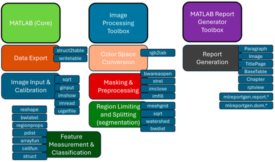 In this study, we propose a fully automated MATLAB-based image processing system designed to evaluate surface and internal defects in components subjected to NDT. The system supports both PT in accordance with EN ISO 3452-1 [56] and RT performed using ISO 17636-1 [57] with scanned physical X-ray films. The developed system integrates tools from MATLAB’s Core Environment, Image Processing Toolbox and Report Generator Toolbox, forming a complete analysis environment that spans from image acquisition to structured report generation (Figure 1).