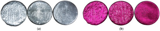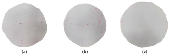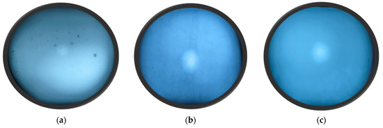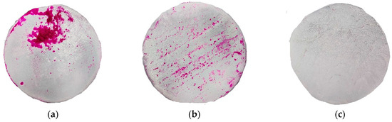The penetration method is based on the penetration of liquids into defect cavities. Penetration testing is a valuable technique used in white metal coating technologies to detect surface defects and to assess the quality of coated materials. Due to the capillary effect of surface cracks, capillary pressure acts on the penetrant and forces it to fill the crack cavities in the white metal layer. Basically, a penetrant test is performed by applying a penetrating liquid, often a colored dye or a fluorescent liquid, to the surface of the white-metal-coated component. The penetrant penetrates the damage cavity until the pressure of the air trapped in the crack equals the capillary pressure before it starts to act. At this point, the maximum depth of penetration of the penetrant into the crack is reached. After sufficient time for penetration, the excess penetrant is removed from the surface. A developer, usually a white powder or developer spray, is then applied. This developer draws the penetrant out of the defects, creating visible indications. These indications can be examined by their size, shape and intensity [66]. The penetration testing process started with a surface penetration study of the specimens. To properly understand what defects the specimens have in their structure, one must start at the very top layer (Figure 3).