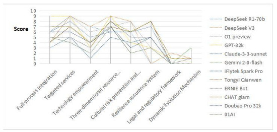 The characteristics of Chinese models are as follows: Tongyi Qianwen excels in resilience assurance systems (8 points), and ERNIE Bot leads in multi-dimensional resource networks (8 points). The overall weaknesses mirror those of international models in legal frameworks and dynamic evolution mechanisms.