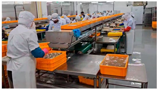 Seafood production plays a critical role in the manufacture and distribution of a wide variety of food products, and it has established itself as one of the most important global industries [,]. However, the productivity of this industry remains limited due to its continued reliance on manual labor and outdated processing equipment. With the growing public interest in seafood consumption, there is increasing demand for enhanced quality control and reduced distribution time to preserve product freshness. To meet these demands and improve overall efficiency, the seafood industry is undergoing a transition from traditional labor-intensive methods to smart, digital technologies. This transformation is essential not only for improving productivity but also for ensuring the consistent and safe production of food. Automation and robotic technologies are being actively adopted to reduce production costs and improve product quality [,,].