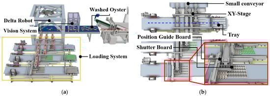 System configuration of the automated oyster classification process: (a) Automated process system for oyster classification; (b) Oyster tray loading mechanism.