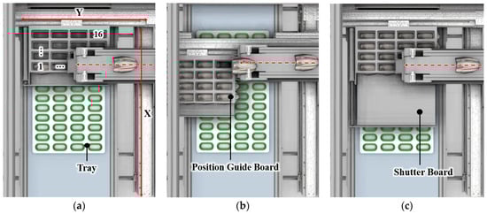 Figure 3 illustrates the loading system. It consists of an XY-stage, a position guide board, and a shutter board, which together enable the transferred oysters to be accurately loaded into trays. Both the position guide board and the shutter board are mounted on the XY-stage and are designed to move along the X and Y axes. Since the loading system sorts oysters into large, medium, and small categories, it is structured into three separate lines: the Large-line, Medium-line, and Small-line [].