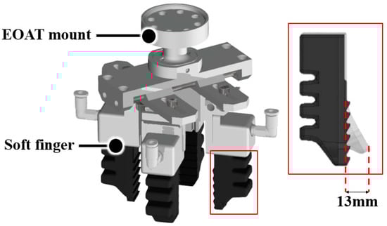 Figure 4 illustrates the soft gripper applied to the system. To effectively grasp oysters, the gripper was equipped with four soft fingers (F-B4T/LS8[P], Rochu in Zhangjiagang, China). When positive pressure is applied to the soft fingers, they bend inward toward the center, thereby converging toward the center of the gripper to securely hold the oyster. In addition, protrusions are formed on the contact surfaces with the oyster, which help prevent slippage or downward movement after grasping [].