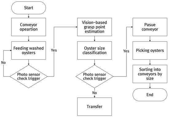 Figure 5 illustrates the flowchart of the automated pick-and-place system for oyster size classification. Washed oysters are delivered via a conveyor, and when a signal is detected by a photo sensor that confirms oyster input, a vision camera inside a dark room for the vision process identifies the size and grasping point of each oyster. Here, it was assumed that, since the cleaned oysters are positioned randomly on the conveyor, the operator rearranges those that are overlapped or located outside the recognition area to ensure accurate detection of the oysters. Using a parallel robot, the oysters are grasped and placed onto separate conveyors according to their size. The oysters placed on each size-specific conveyor are then transported and loaded into trays through a dedicated loading mechanism.