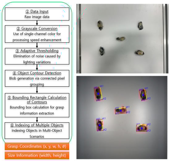 The algorithm for recognizing the size and grasping positions of multiple oysters, which are washed and transported on a conveyor, is structured as shown in Figure 6. To process the entire area of the oysters in transit, a 5 MP camera positioned at a height of 215 mm captures RGB images at 22 frames per second, covering the full width of the conveyor based on the field of view (FOV). To enhance processing speed, the captured RGB images are converted into a single-channel format. The converted images then undergo adaptive binarization and morphological operations to minimize the effects of lighting and generate bounding rectangles, which define regions of interest (ROIs). Within each ROI, image moments are calculated to determine grasping positions, and the size is classified based on the width and height of the ROI. Finally, each oyster in the image is indexed, and grasping position and size information are assigned to each detected oyster.