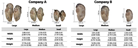 denotes the area, and represents the pixel value when the point is 1 (white). The actual size classification was based on oyster area data obtained from seafood processing companies in South Korea, as shown in Figure 7. The results derived from the equations were converted into mm2 area units and then categorized into three size groups: large (L), medium (M), and small (S). Images captured during the experiments depict model oysters whose dimensions were calibrated to match the real-size measurements obtained in our field investigation.