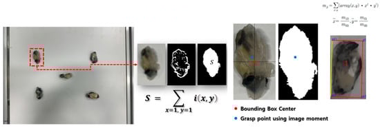 spatial moment is calculated using Equation (2), and the centroid coordinates corresponding to the grasp point (, ) are derived using Equation (3):