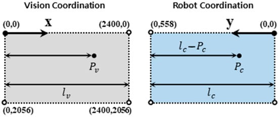 Since the positive x-direction in the vision image corresponds to the negative y-direction in the robot’s coordinate system, the length of is equal to . This relationship is expressed as a proportional formula, as shown in Equation (4).