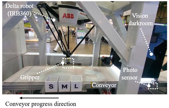 Figure 10 illustrates the configuration of the testbed constructed in this study to evaluate the performance of core technologies for automating the oyster processing line. The testbed consists of a conveyor, a dark room for the vision process, an internal camera for oyster recognition, a photo sensor to detect oyster input, a parallel robot for grasping, and classification buckets for classification. As shown in Figure 10, although a soft gripper is typically attached to the end of the parallel robot for grasping, it was replaced with a camera to verify the performance of vision-based grasp point estimation. If the estimation is accurate, the grasping point should coincide with the center of the camera image, since the center of the gripper and the center of the camera image are aligned during operation.