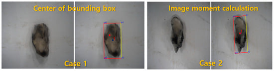 center may become unreliable. To address these issues, image moments are employed to estimate a more appropriate grasp point. Image moments represent the weighted average of pixel intensities within a region. As illustrated in Figure 8, a comparison between the center of the bounding rectangle (red dot) and the moment-based grasp point (blue dot)