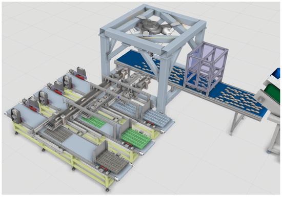 As shown in Figure 12, a process simulation was conducted using the Visual Components software environment to perform a comparative productivity analysis between the conventional manual oyster classification process and the developed automated oyster classification system. The simulation was based on the actual working conditions of Deokyeon Seafood Co., Ltd. in Tongyeong-si, a domestic oyster processing company in South Korea. In the manual process, 60 workers operate for 8 h a day, achieving a daily production volume of 7 tons. Based on harvest data from October to the following May, the distribution of oyster sizes was approximately 30% large, 50% medium, and 20% small, with average weights of 20 g, 15 g, and 10 g, respectively. It was confirmed that, assuming a 100% recognition and grasping success rate, at least seven automated systems would be required to match the production volume of the manual process.