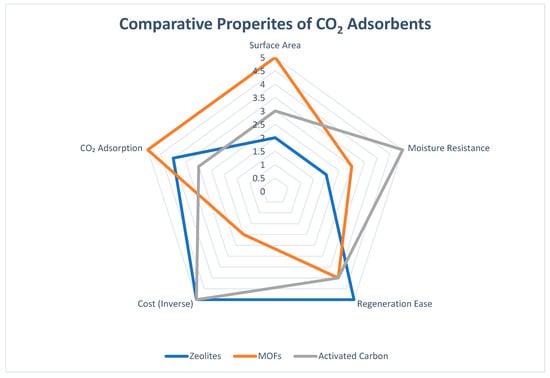 To quantitatively compare the performance of zeolites, metal–organic frameworks (MOFs), and activated carbons as CO2 adsorbents, a radar chart (as seen in Figure 1 and Table 1) was created. The chart evaluates five key properties that influence the effectiveness of adsorbents in CCS applications: surface area, moisture resistance, ease of regeneration, cost (inverted, with higher values indicating lower relative cost), and CO2 adsorption capacity. Zeolites demonstrate strong ease of regeneration and cost-effectiveness, but their performance is limited by low moisture resistance [8]. MOFs have the highest surface area and CO2 uptake potential; however, their high cost and moderate regeneration requirements may restrict scalability [11]. Activated carbons offer a balanced profile with excellent moisture resistance, low cost, and good regeneration capabilities, though they generally have lower CO2 selectivity compared to MOFs or zeolites [12]. This comparison highlights the trade-offs involved in selecting materials and supports the idea of hybrid systems that combine different adsorbents to maximize overall effectiveness across various geological conditions.