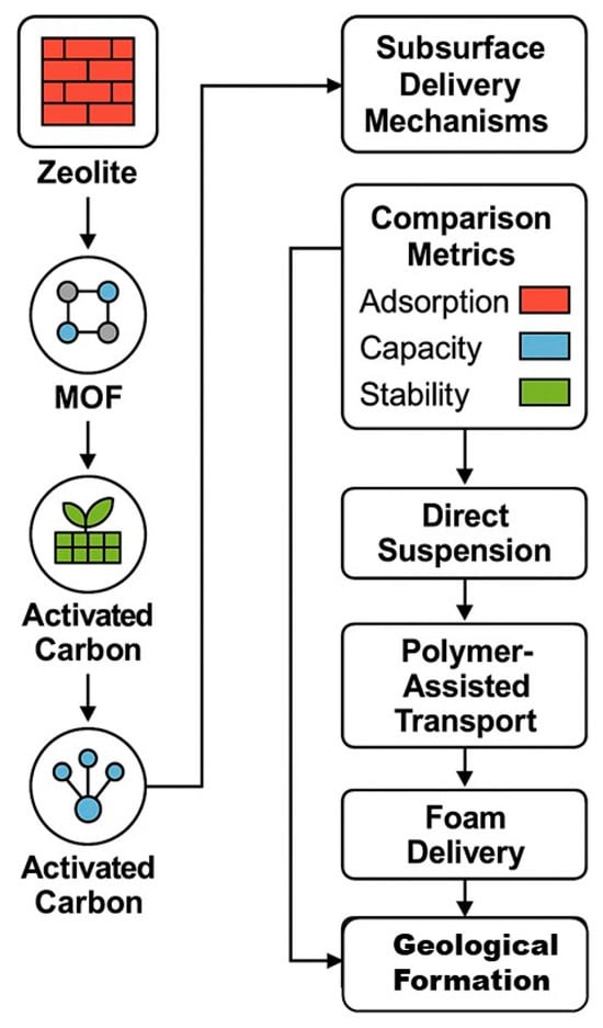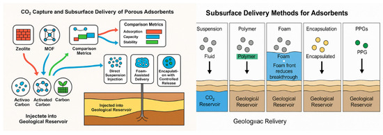 Integrated flowchart showing the CO2 capture potential of zeolites, MOFs, and activated carbons (left) alongside subsurface delivery methods (right). Adsorbents are assessed based on performance metrics (adsorption, capacity, stability) and then transported into geological formations using techniques such as direct suspension and polymer particle gels. This visual summary aids in material selection and deployment strategies for carbon capture and storage (CCS) systems.
