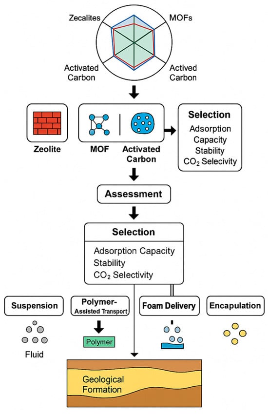 Integrated flowchart illustrating the evaluation and deployment pathway for CO2 adsorbents in carbon capture and storage (CCS) systems. Zeolites, metal–organic frameworks (MOFs), and activated carbons are assessed based on key performance metrics—adsorption capacity, structural stability, and CO2 selectivity. These materials are then delivered into geological formations via engineered strategies, including direct suspension, polymer-assisted transport, and foam delivery. The diagram emphasizes the interdependence of material properties and delivery mechanisms in achieving efficient, scalable CO2 sequestration.