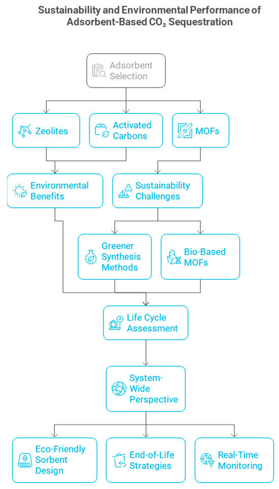The sustainability of carbon capture and storage (CCS) technologies is increasingly evaluated not only by technical feasibility and economic cost, but also by their environmental footprint and life cycle performance. The use of solid adsorbents such as zeolites, metal–organic frameworks (MOFs), and activated carbons offers a pathway toward more environmentally conscious CCS strategies, particularly when these materials are sourced or synthesized with sustainable practices in mind (Figure 5).