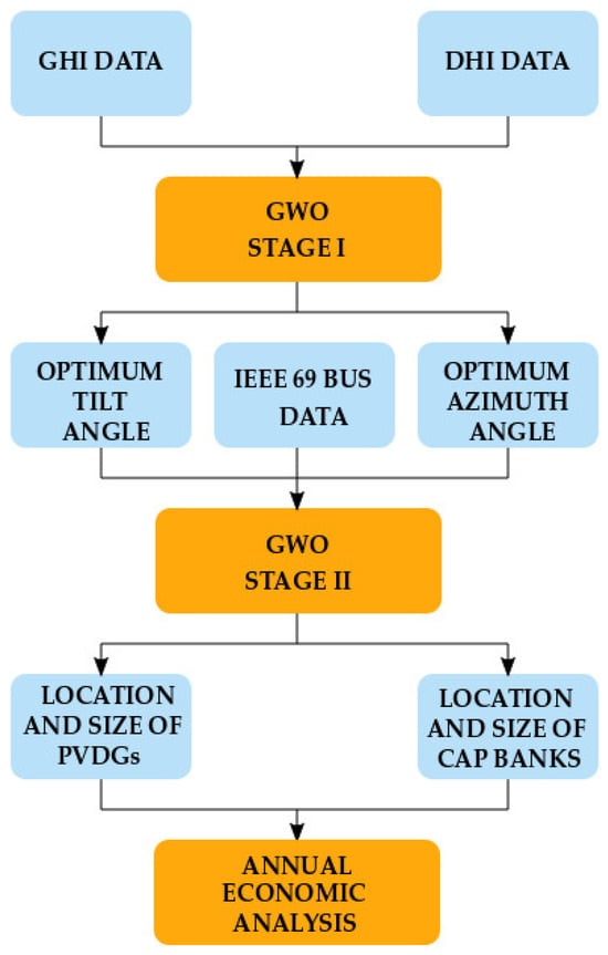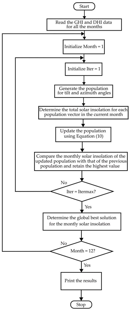 - First, the optimal tilt and azimuth angles are determined for each month using one year of solar insolation data, which includes Global Horizontal Irradiance (GHI) and Diffuse Horizontal Irradiance (DHI). The GWO algorithm is applied with the objective of maximizing incident solar irradiance, thereby ensuring improved energy capture through monthly orientation adjustment.