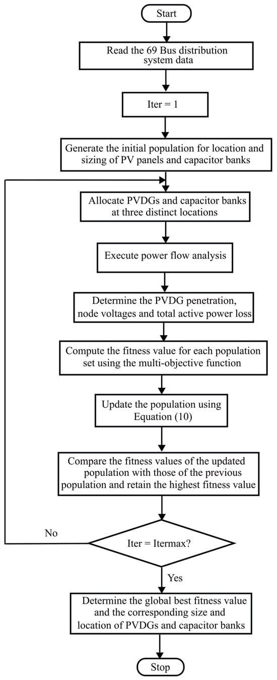 - Solar Power Capacity (SPC): This objective aims to ensure that the total real power injected by the solar PV distributed generation (PVDG) units is equal to a specified fraction of the total real power demand of the distribution system load.where is the real power load at the jth node of the distribution system, is the ith PVDG capacity, NL is the total load buses, and is the number of solar PV generation plants. is the fraction of total active power load chosen between 0 and 1.The value of is chosen as 30% in this study. Although higher PV penetration levels are feasible depending on available space and investment capacity, a 30% cap is adopted in this study to maintain grid stability and economic viability. Penetration beyond this level can lead to issues such as overvoltage, reverse power flow, voltage flicker, and increased power losses under light load conditions [48]. This limit is consistent with utility planning practices that aim to balance renewable integration with distribution system reliability. It also helps avoid the need for extensive infrastructure upgrades while aligning with hosting capacity constraints.