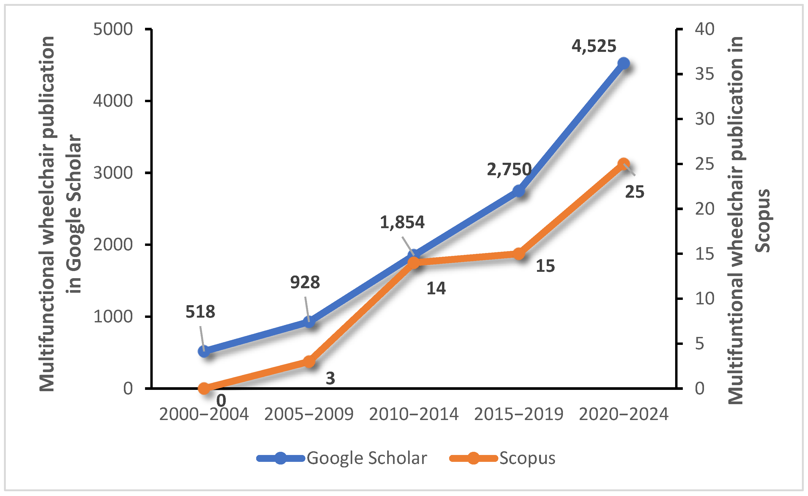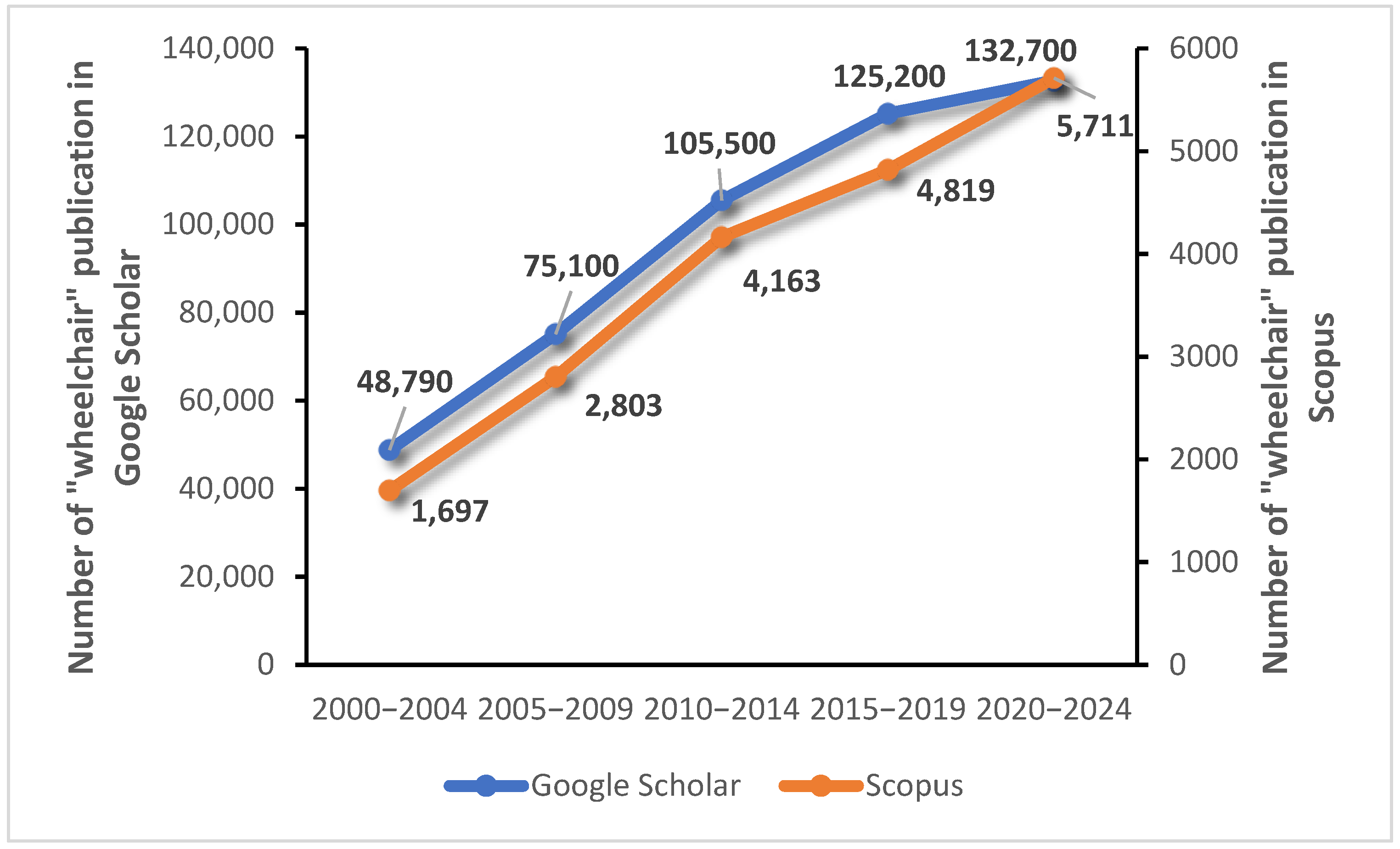 4]. As such, there is a steady increase in the number of “wheelchair” publications in both Google Scholar and Scopus, as displayed in