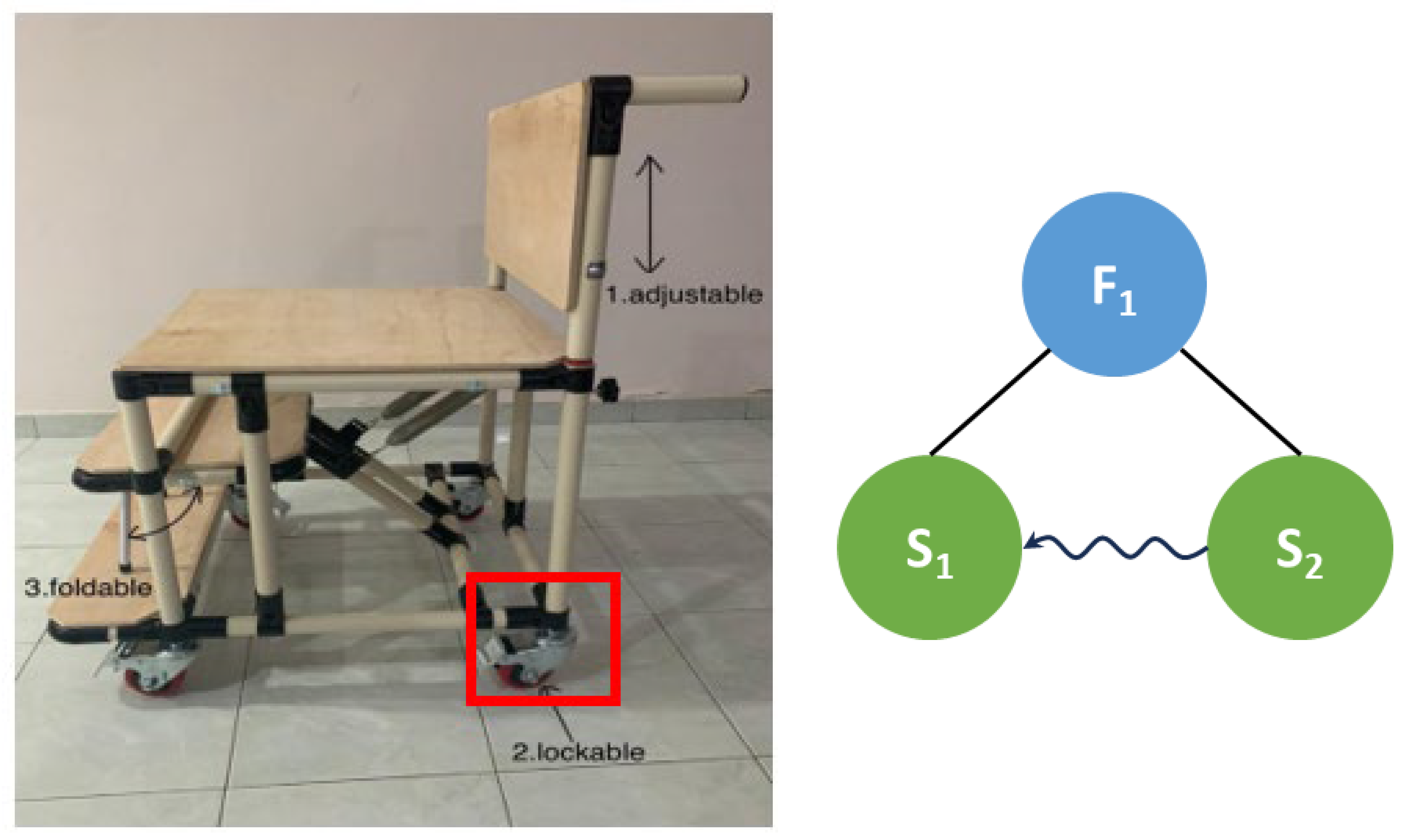 The second research question (RQ2) explored the application of the Su-field analysis for modeling the issues. The elements and interaction types were identified, and suitable classes from Standard Inventive Solutions (SIS) were selected, followed by leveraging specific TRIZ tools, such as segmentation, dynamic parts, nested doll structures, and composite materials. As a result, the method addressed the following issues of current wheels that could induce injuries, lack of armrests, difficulty in transforming the invention, and inaccessible wheels hindering maneuverability from a seated position.