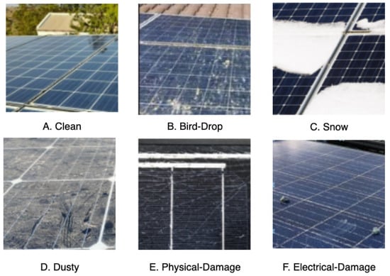 Our study utilizes a dataset comprising 885 image samples [] of PV modules distributed across six distinct fault classes (as shown in the Figure 1): Physical-Damage (69 images, 7.80%), Electrical-Damage (102 images, 11.53%), Snow-Covered (119 images, 13.45%), Clean (192 images, 21.69%), Dusty (188 images, 21.24%), and Bird-Drop (215 images, 24.29%). The dataset exhibits significant class imbalance with an imbalance ratio of 3.12:1 between the most represented class (Bird-Drop) and the least represented class (Physical-Damage). Our classification system identifies both permanent defects (Electrical-Damage, Physical-Damage) and temporary performance-reducing conditions (Snow-Covered, Dusty, Bird-Drop) for comprehensive automated monitoring. Electrical-Damage in visible imagery manifests as burn marks, cell discoloration, dark spots, and visible degradation patterns resulting from electrical faults. We recognize the dataset size constraints inherent to specialized industrial imaging applications. While our augmentation strategy addresses immediate practical needs, future work with larger, naturally balanced datasets will provide stronger validation of our approach.