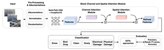 The proposed methodology establishes a comprehensive framework for automated fault detection in PV modules using visible-light-based imagery. As illustrated in Figure 2, our approach implements a sequential pipeline that begins with rigorous data preprocessing and augmentation, continues through feature extraction via a Multi-Path CNN architecture, and culminates in fault classification through an innovative dual-attention mechanism. The SolarFaultAttentionNet architecture is specifically designed to identify subtle anomalies associated with various PV module faults, enhancing detection accuracy while maintaining computational efficiency for practical deployment scenarios. Our approach addresses the challenges of dataset imbalance, environmental variability, and the need for fine-grained feature discrimination that are inherent to PV fault detection applications.