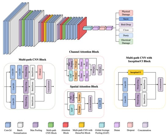 The SolarFaultAttentionNet architecture, depicted in Figure 3, integrates a Multi-Path CNN backbone with specialized attention mechanisms [] to enable precise fault classification in PV modules. Our design consists of three primary components that work synergistically to extract and emphasize discriminative features for fault detection.