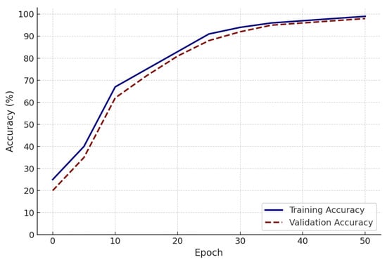 SolarFaultAttentionNet substantially outperforms all comparison models, achieving 99.14% accuracy, which represents a 5.14 percentage point improvement over the next best model. This superior performance extends across precision (98.63%), recall (98.24%), and F1 score (98.42%). Notably, SolarFaultAttentionNet maintains competitive inference time (0.0160 s), comparable to models like VGG16 (0.0161 s), while delivering significantly higher accuracy. The memory footprint of 2697.07 MB further demonstrates the efficiency of the proposed architecture despite its more sophisticated design. To address potential overfitting concerns, given the high accuracy achieved, Figure 4 presents the training and validation accuracy curves for SolarFaultAttentionNet. The curves demonstrate stable convergence with minimal divergence (0.23% gap), indicating effective generalization, rather than the memorization of training patterns. The smooth progression and early convergence around epoch 47 support the model’s ability to learn genuine discriminative features for fault detection.