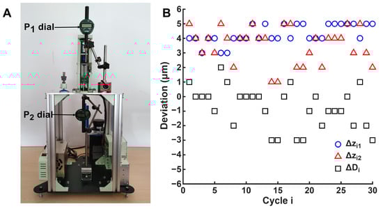 Accuracy and repeatability tests. (A) Experimental setup. (B) Differences between theoretical and actual positions for () and (), and between the theoretical and actual displacement of the linear actuator ().