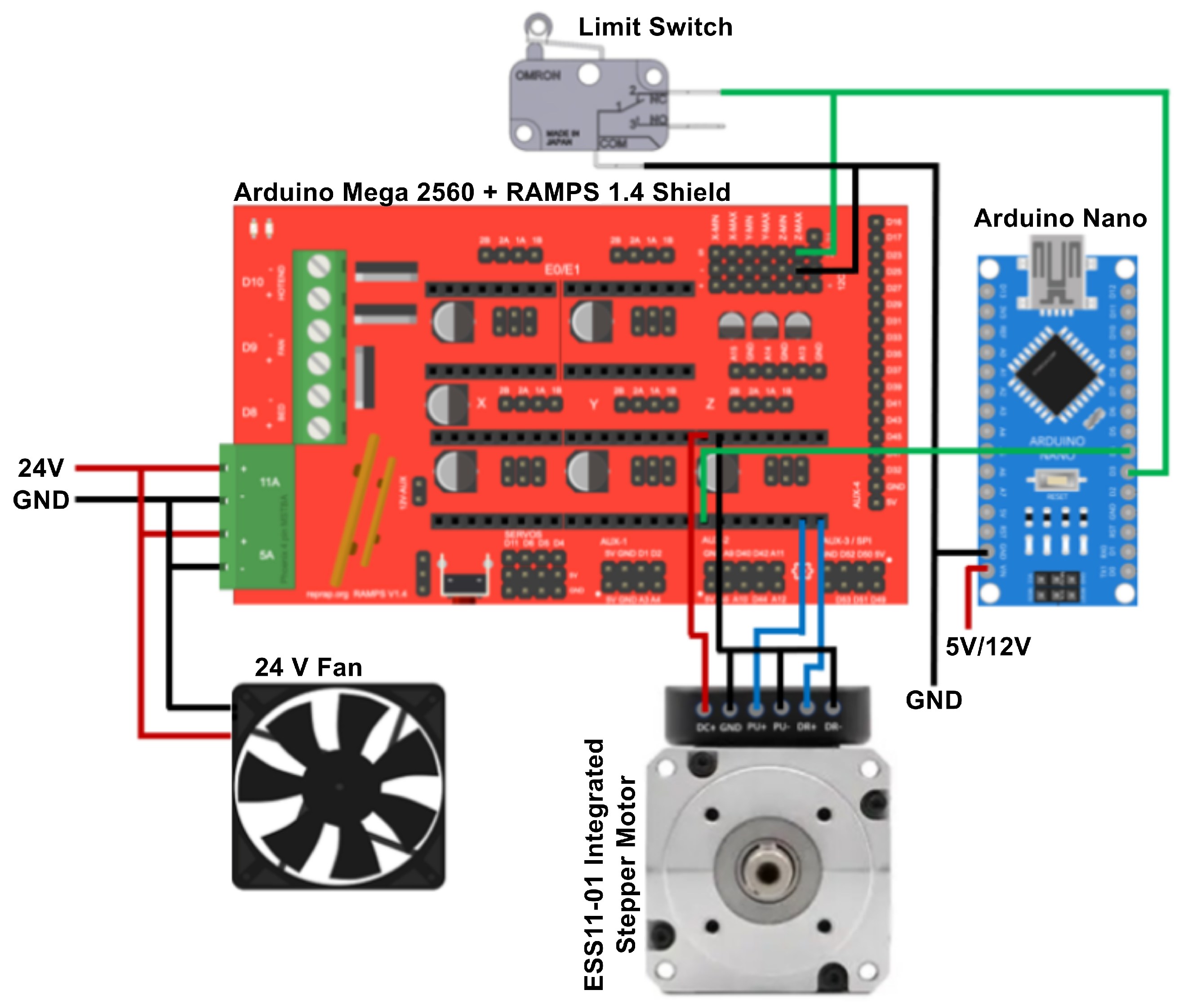 The electronic system was powered by a 24 VDC, 15 A power supply (Mouser Electronics, Inc., Barcelona, Spain), operating within an input voltage range of 110–220 VAC. A NEMA 11 closed-loop bipolar stepper motor model ESS11-01 (StepperOnline, Nanjing, China) was employed to drive the vertical axis. The control architecture was based on the Arduino platform. Specifically, an Arduino Mega 2560 microcontroller board (Arduino, Turin, Italy) served as the central processing unit (CPU) and was interfaced with a RAMPS 1.4 shield (RepRap Project, Bath, UK). An auxiliary Arduino Nano board was integrated to synchronize motion system components.