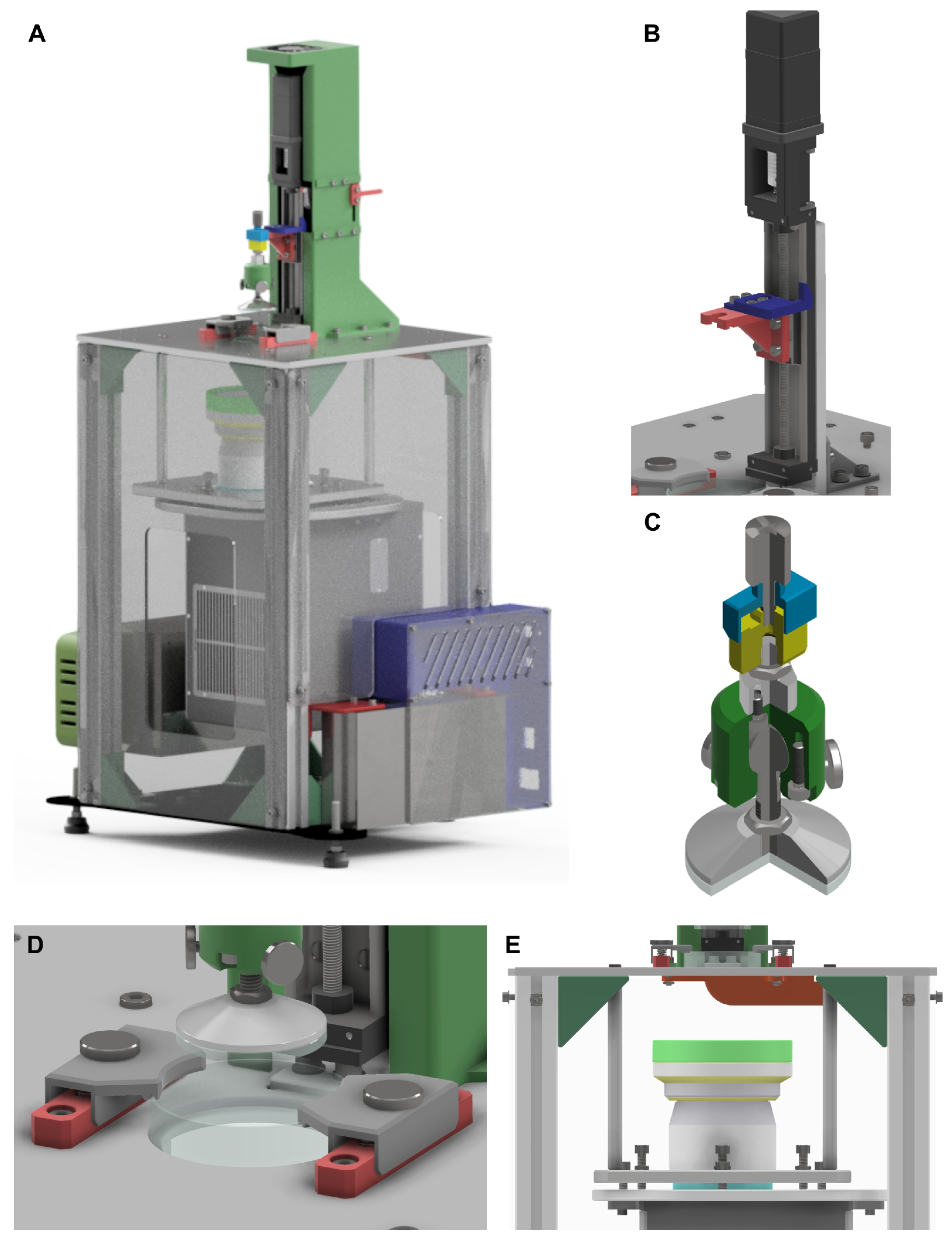 Design of the light-based VP bioprinter. (A) General CAD model of the fully assembled system. (B) Z-axis module, (C) main stage, (D) vat-fixation mechanism, and (E) light source system.