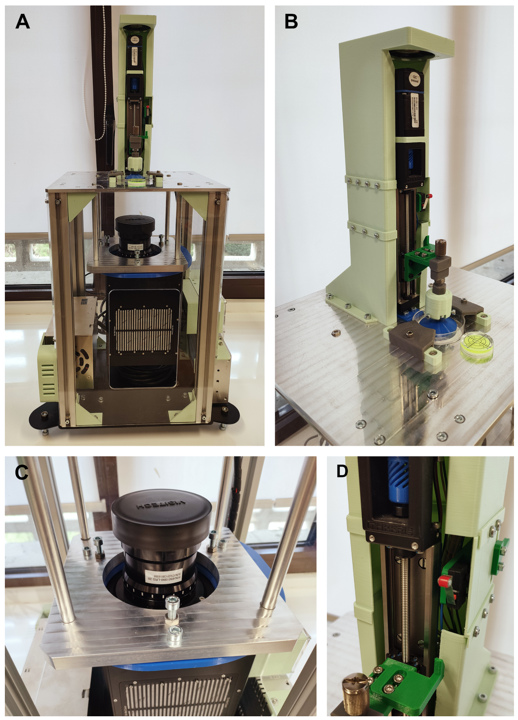 All modules were assembled onto the structural module, which can be identified in Figure 2A. This metallic frame was designed to provide sufficient rigidity to minimize vibrations during operation while also supporting overall system calibration. A three-leg calibration system with anti-vibration feet was implemented to ensure horizontal alignment of the upper platform. The lower platform was planned to be fabricated from plasma-cut steel, whereas for the upper platform the technology assigned was High-Speed Machining (HSM) to meet the required geometrical and dimensional tolerances. The upper platform also included precisely designed pockets for the accurate positioning of the Z-axis frame and the Petri dish. The results of the final prototype are shown in Figure 3.