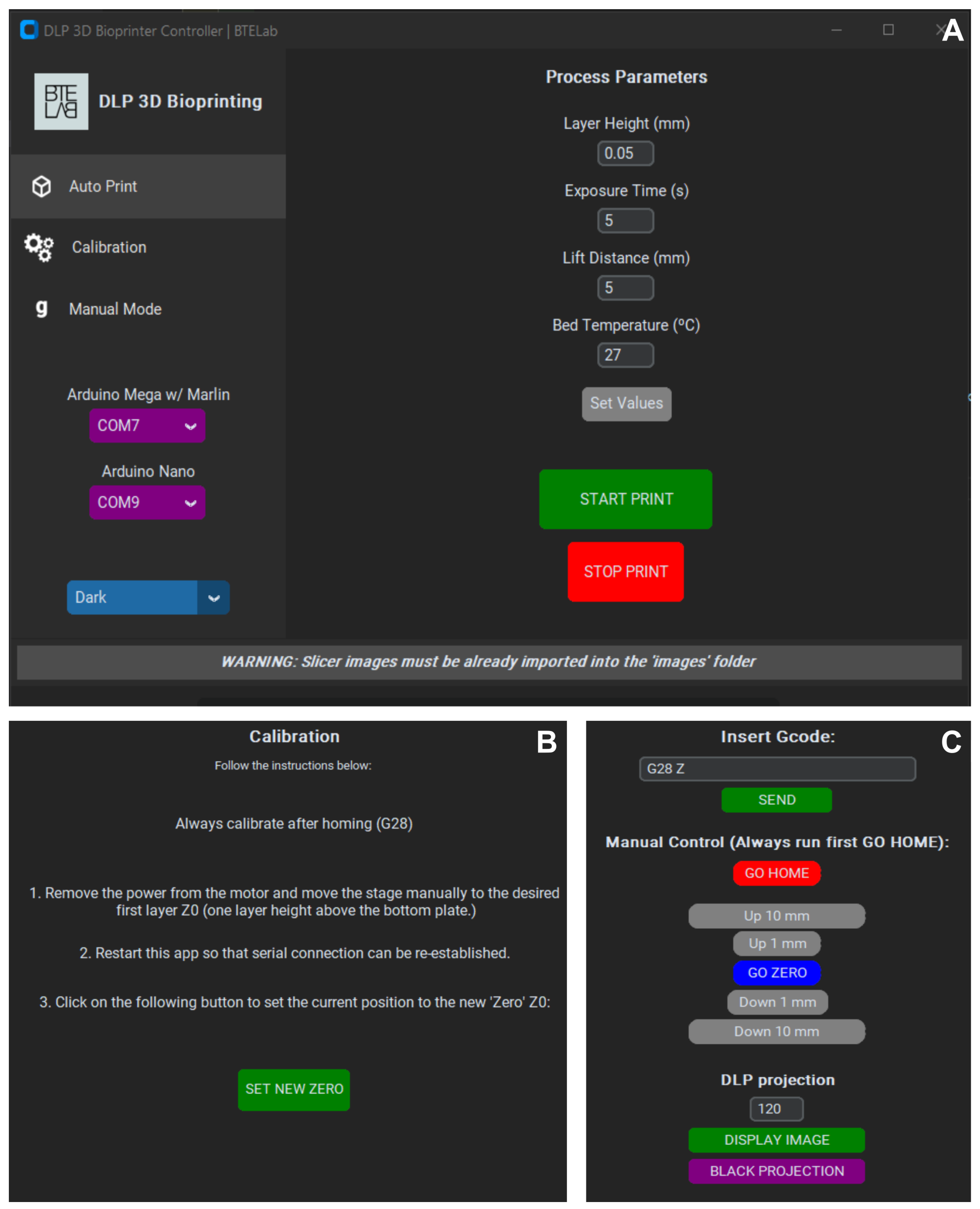 Main menus of the open-source GUI software: (A) Auto Print, (B) Calibration, and (C) Manual Mode.
