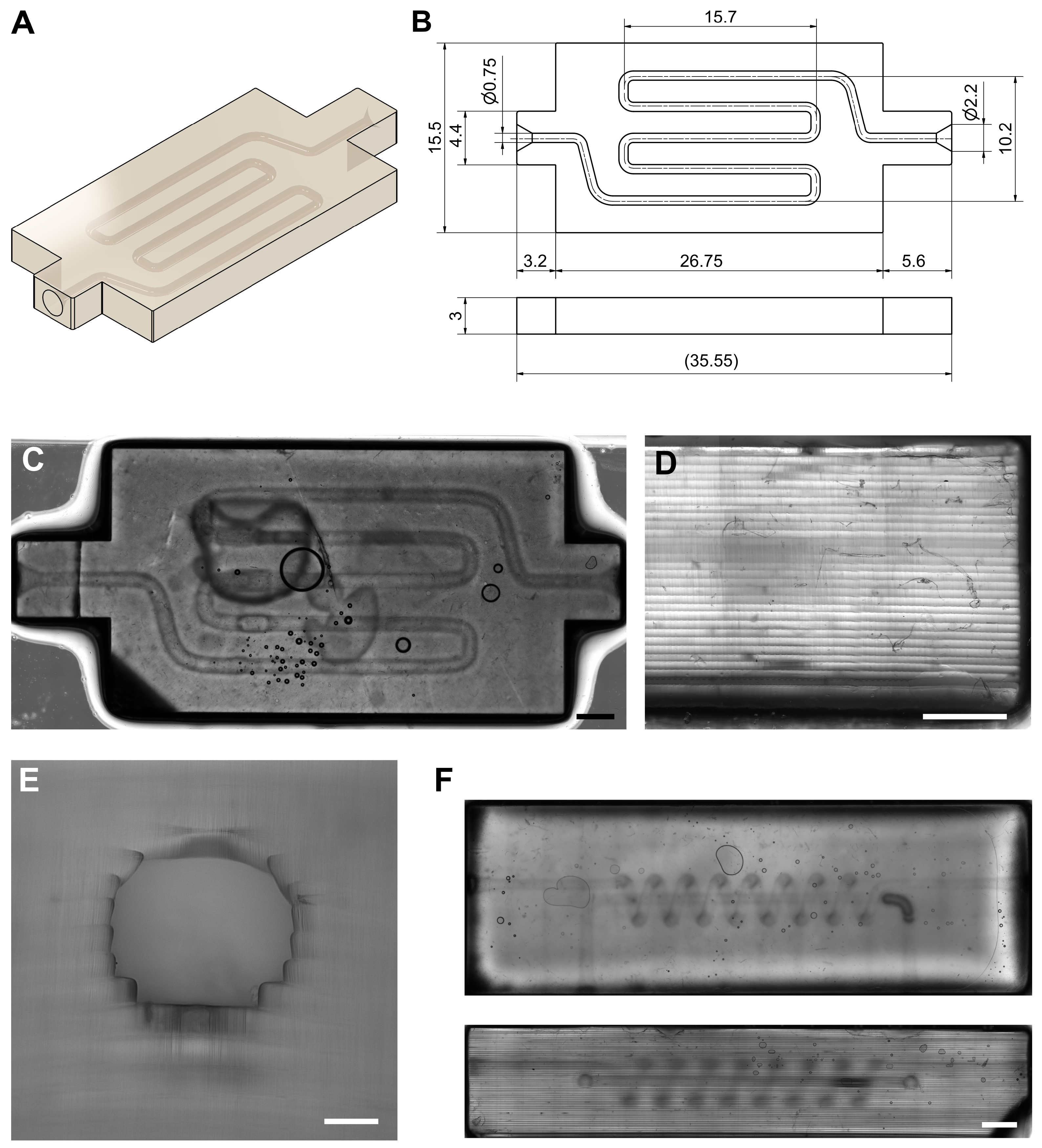 Representative images of the microfluidic serpentine micro-channel model printed with the DLP: (A) overview of the three-dimensional model; (B) main dimensions of the model; (C) top view of a printed model (Scale bar: 2 mm); (D) details of the printed layers in the lateral view (Scale bar: 1 mm); (E) detail of the circumferential ducts (Scale bar: 200); (F) top (up) and lateral (down) views of another printed microfluidic serpentine model (Scale bar: 2 mm).
