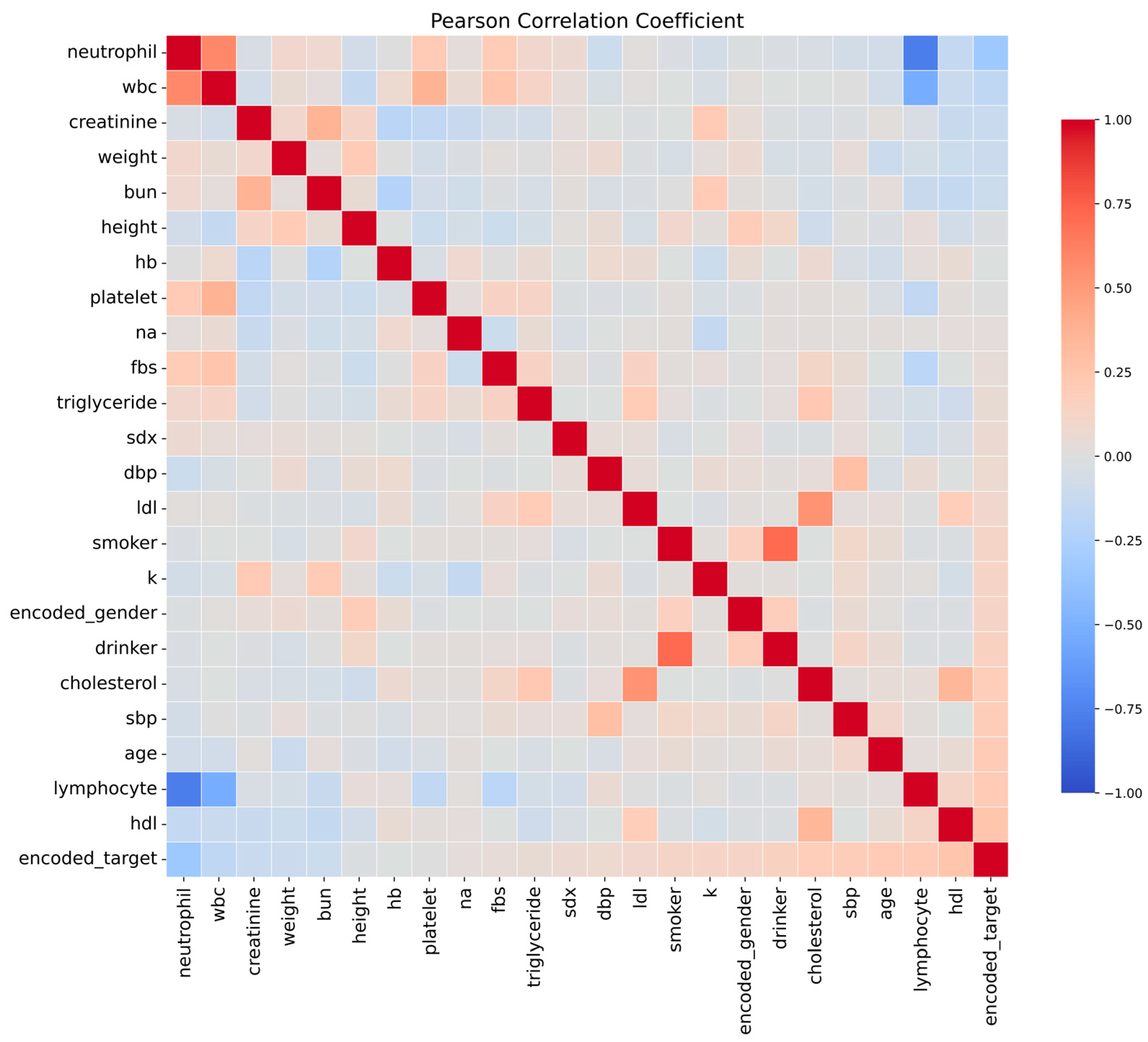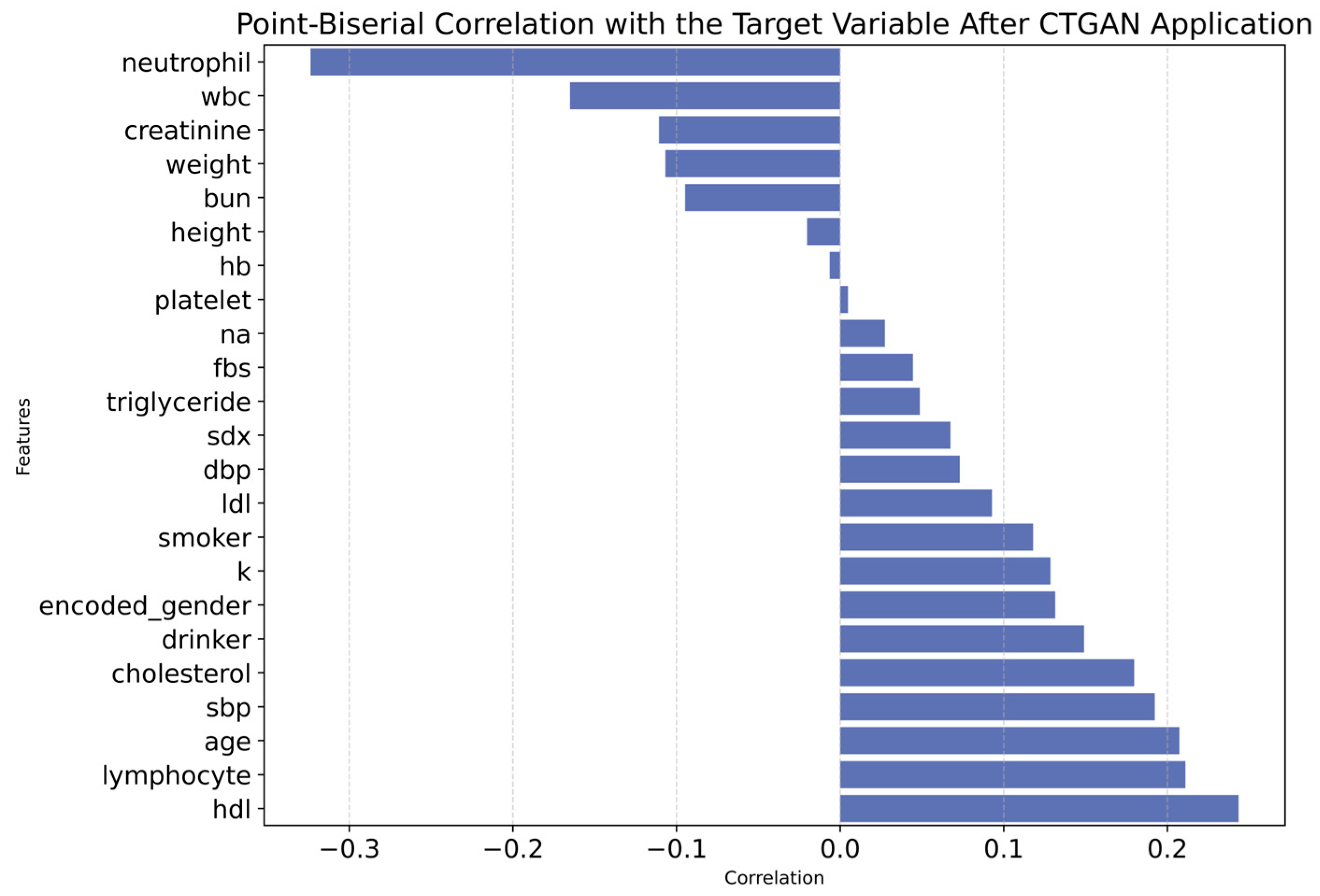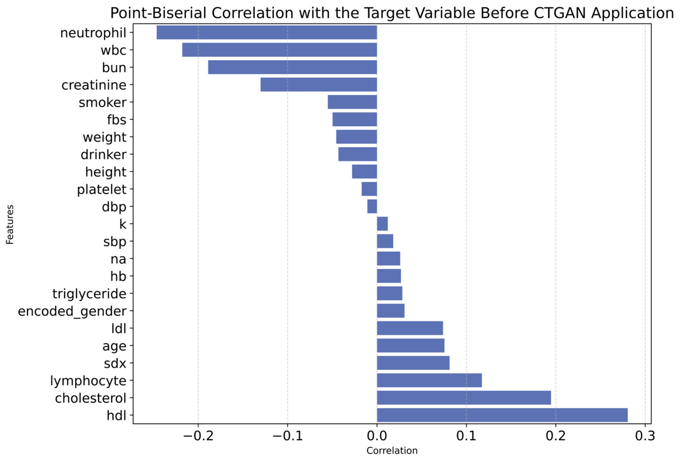 As shown from Figure 6, several key relationships emerged from the original training dataset. Age showed a moderate positive correlation of 0.075, indicating that older individuals have a slightly higher likelihood of the target outcome. Weight, height, and systolic blood pressure exhibited weaker correlations, with weight and height having negative correlations of −0.046 and −0.028, respectively, and systolic blood pressure showing a negligible positive correlation of 0.018. Cholesterol and HDL demonstrated stronger positive correlations with the target, at 0.195 and 0.280, respectively, indicating their significant association with the target. In contrast, low-density lipoprotein (LDL) had a moderate positive correlation of 0.074, while triglycerides and fasting blood sugar presented relatively weak correlations of 0.028 and −0.050, respectively. Creatinine and BUN showed negative correlations of −0.130 and −0.189, respectively, reflecting their inverse relationship with the target. Among hematological features, white blood cells and neutrophils exhibited the strongest negative correlations with the target, at −0.218 and −0.246, respectively, suggesting that higher levels of these components are associated with a lower likelihood of the target outcome. Lymphocytes had a moderate positive correlation of 0.117, indicating a slight association with the target. Gender encoding showed a weak positive correlation of 0.031, while smoking and drinking demonstrated moderate negative correlations of −0.055 and −0.043, respectively.