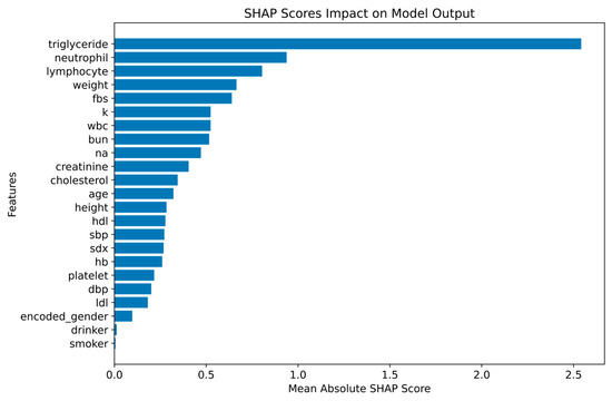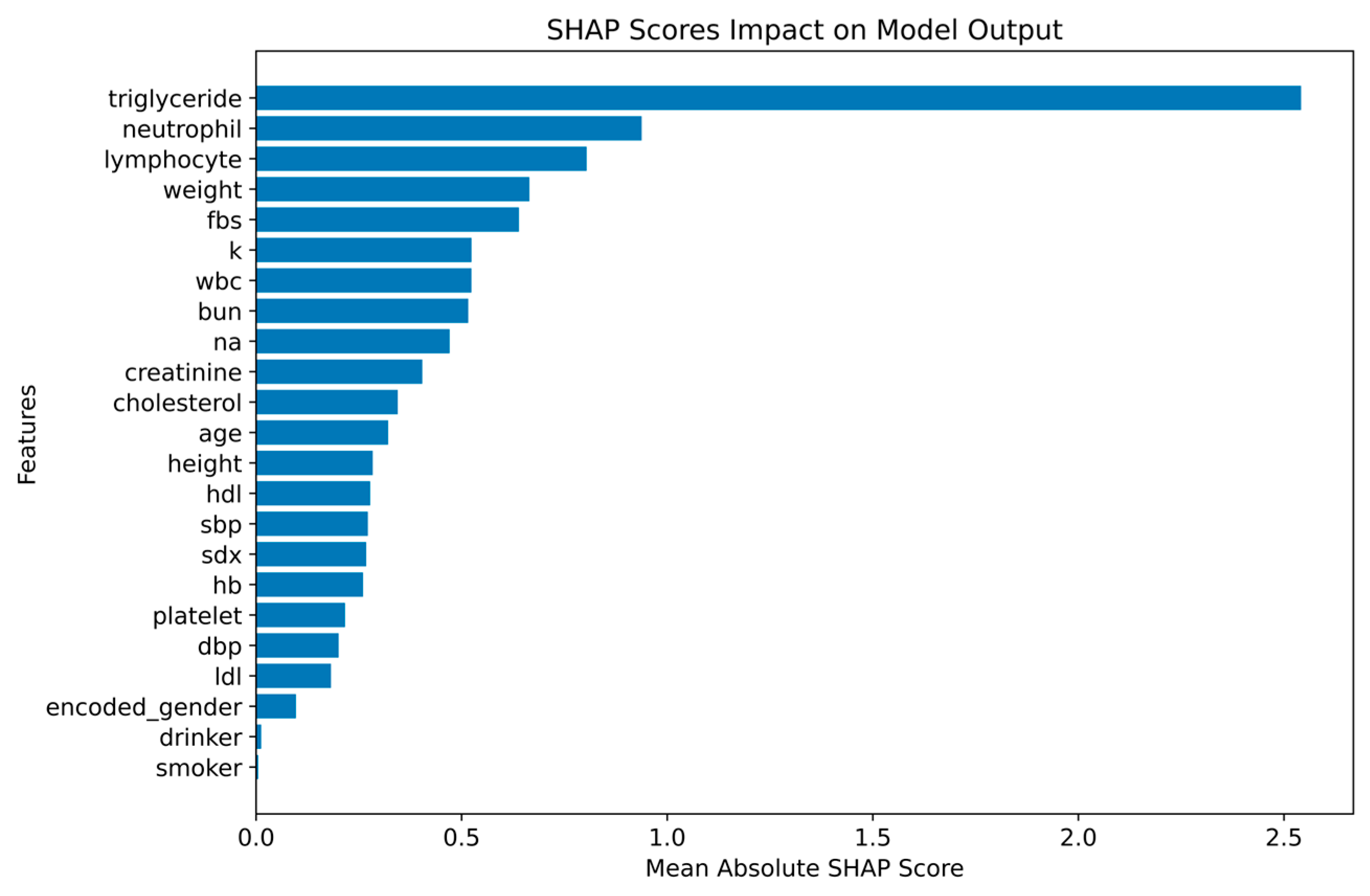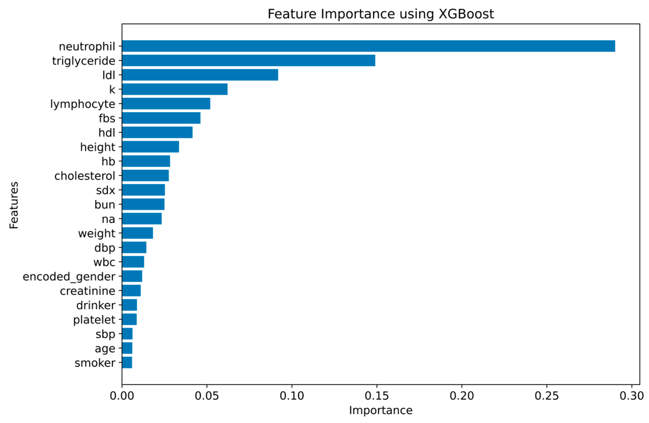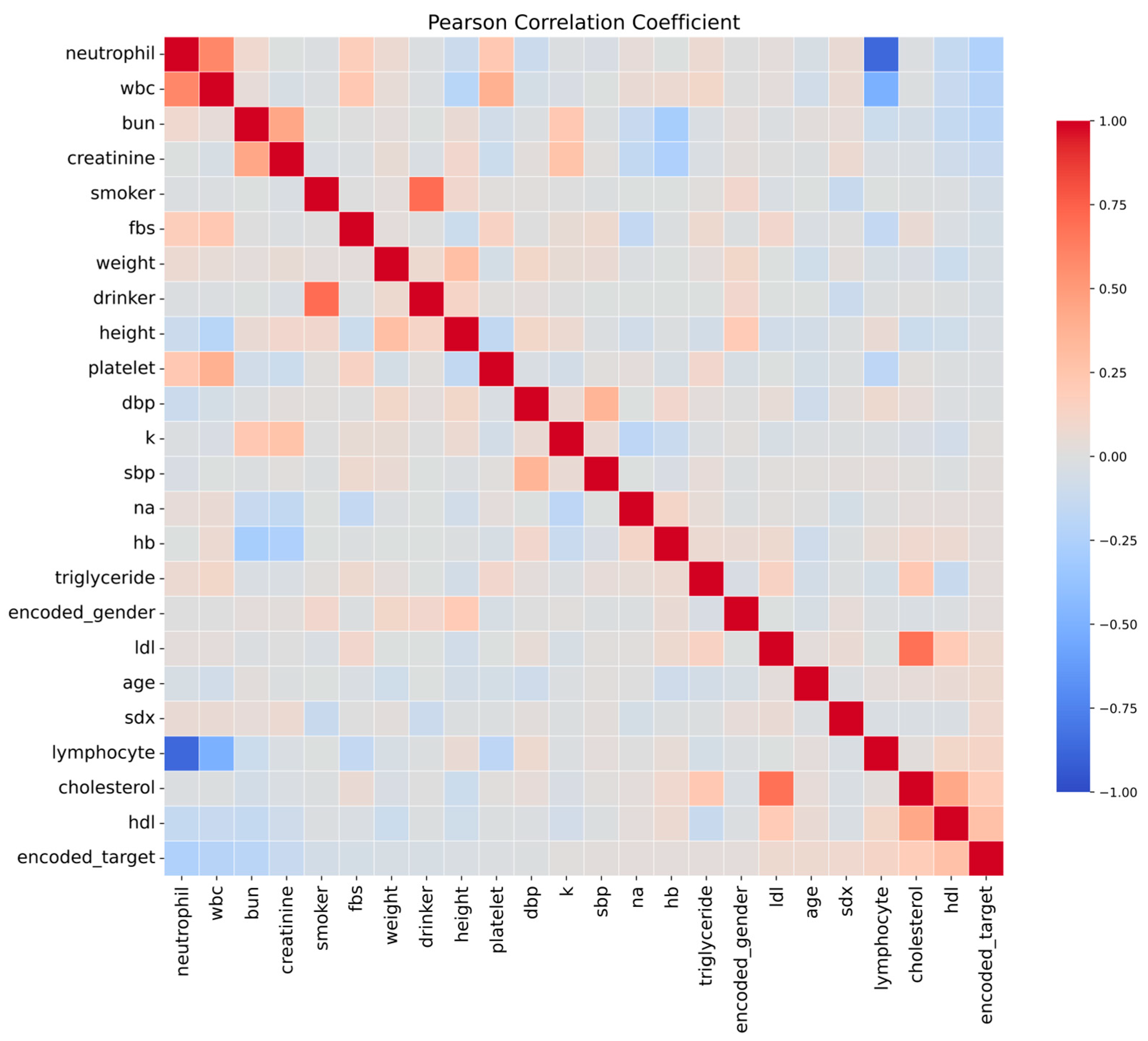 As shown from Figure 6, several key relationships emerged from the original training dataset. Age showed a moderate positive correlation of 0.075, indicating that older individuals have a slightly higher likelihood of the target outcome. Weight, height, and systolic blood pressure exhibited weaker correlations, with weight and height having negative correlations of −0.046 and −0.028, respectively, and systolic blood pressure showing a negligible positive correlation of 0.018. Cholesterol and HDL demonstrated stronger positive correlations with the target, at 0.195 and 0.280, respectively, indicating their significant association with the target. In contrast, low-density lipoprotein (LDL) had a moderate positive correlation of 0.074, while triglycerides and fasting blood sugar presented relatively weak correlations of 0.028 and −0.050, respectively. Creatinine and BUN showed negative correlations of −0.130 and −0.189, respectively, reflecting their inverse relationship with the target. Among hematological features, white blood cells and neutrophils exhibited the strongest negative correlations with the target, at −0.218 and −0.246, respectively, suggesting that higher levels of these components are associated with a lower likelihood of the target outcome. Lymphocytes had a moderate positive correlation of 0.117, indicating a slight association with the target. Gender encoding showed a weak positive correlation of 0.031, while smoking and drinking demonstrated moderate negative correlations of −0.055 and −0.043, respectively.