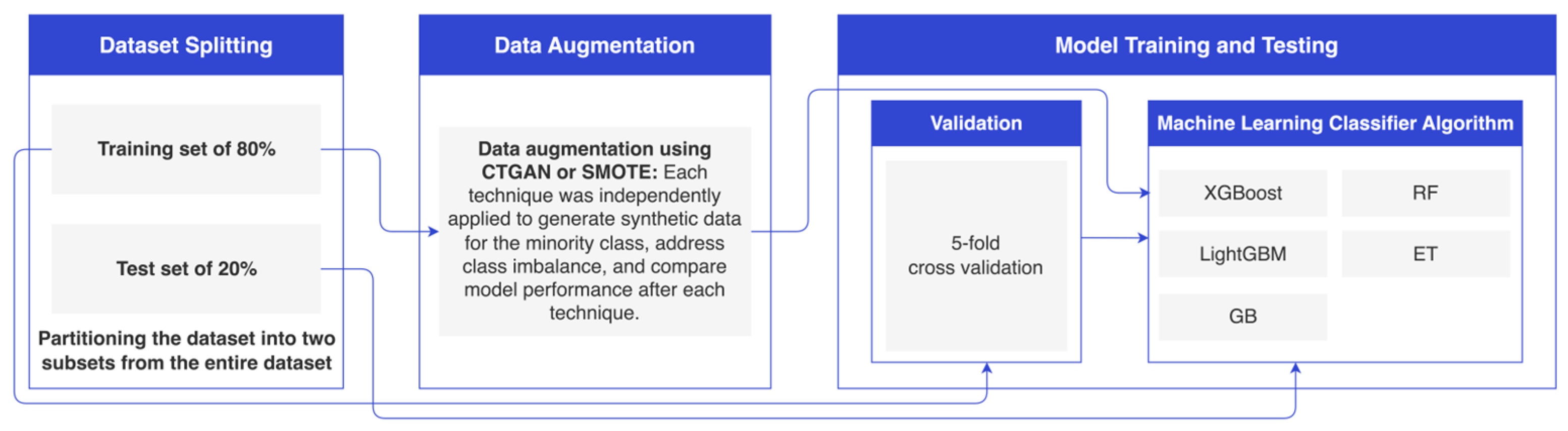 This study evaluated ensemble methods from both the bagging and boosting groups, including XGBoost, LightGBM, GB, RF, and ET. GB sequentially builds decision trees to correct errors at each step, supporting any differentiable loss function. XGBoost enhances gradient boosting with parallel computation, offering faster training and scalability for large datasets. LightGBM, developed by Microsoft, further optimizes training speed and memory efficiency. From the bagging group, RF and ET use multiple decision trees to improve accuracy. RF introduces tree diversity through bootstrap sampling and randomly selects feature subsets at each split. In contrast, ET uses the entire dataset without bootstrapping, introducing randomness by splitting data at randomly chosen thresholds, which can enhance performance in specific scenarios. This study aimed to determine whether data generation using CTGAN could improve the performance of these ensemble methods. To ensure a robust evaluation, a 5-fold cross-validation approach was applied.